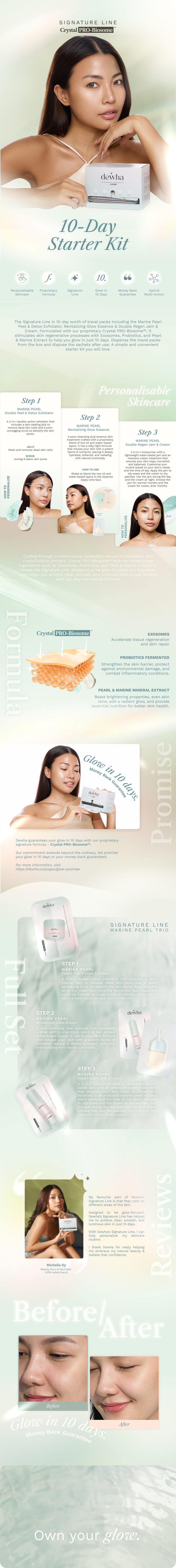 Includes: 3 pcs of Marine Pearl Double Peel & Detox Exfoliator 6g/sachet) + 20 pcs of Marine Pearl Revitalizing Glow Essence 2ml/capsule + 10 pcs of Marine Pearl Double Regen Jam & Cream 2g/sachet