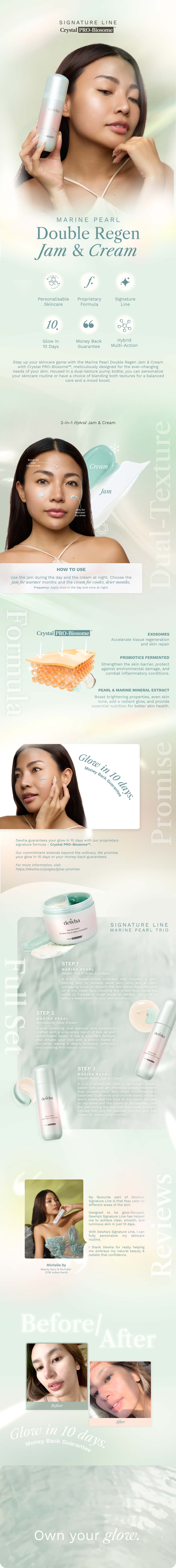 A 2-in-1 hybrid moisturizer with a lightweight water-based jam and an intensive cream treatment that ensures your skin stays nourished and balanced. Personalise your own skincare routine with the Dual-Action System to cater to your skin's needs, the time of day and climate changes. The Signature Line Marine Pearl Double Regen Jam & Cream is formulated with our proprietary Crystal PRO-Biosome™, which stimulates skin regenerative processes with Exosomes, Probiotics and Pearl & Marine Extract to help you glow in just 10 days.
